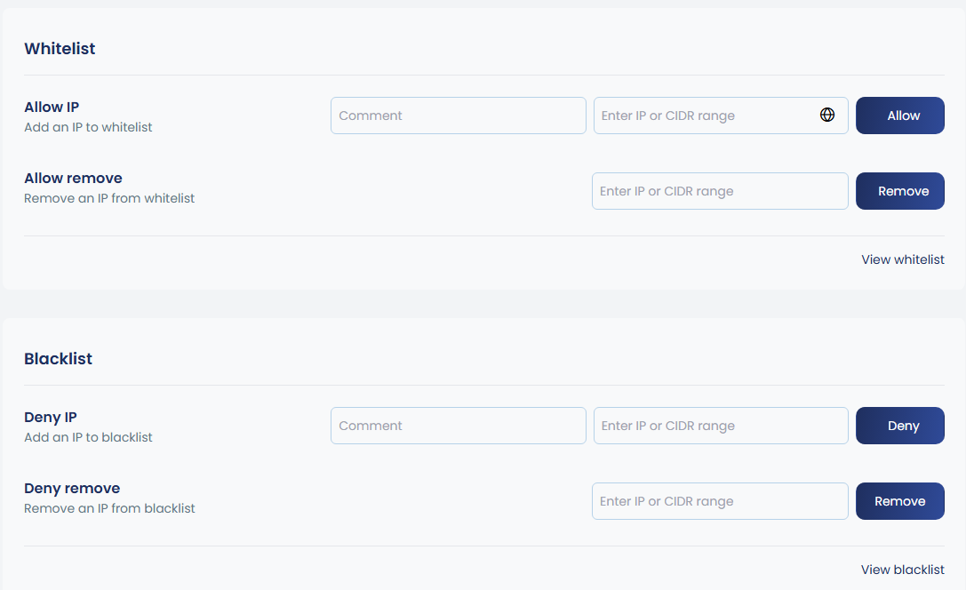 To view all whitelisted and blacklisted IPs, there are options like “View Whitelist” and “View Blacklist.” By clicking these, you can see all the IPs added along with their reasons, and you also have the option to add new entries directly from this view.