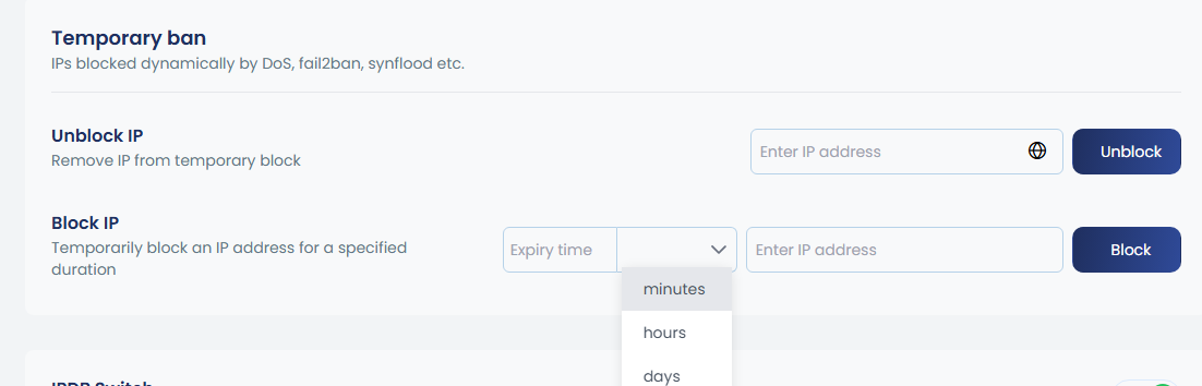 IPs may be temporarily blocked by DoS protection, Fail2Ban, SYN-Flood, etc. If you notice an IP is blocked, you can unblock it by entering the IP in the provided box and clicking Unblock. Default expiry is 24 hours.