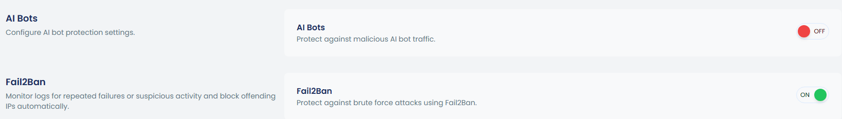 AI bot protection settings and Fail2Ban settings, which can be enabled by switching the toggle to On.