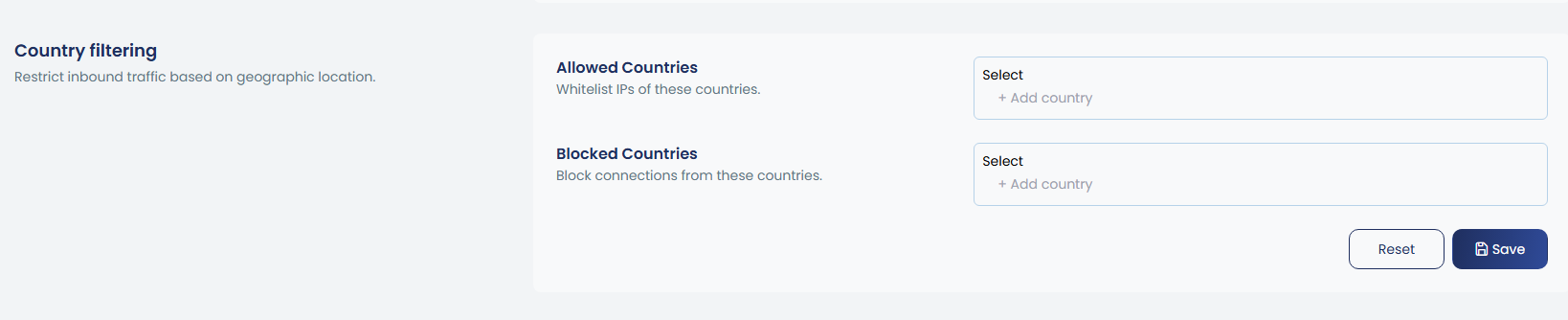 You can whitelist or blacklist entire countries using their ISO codes (e.g., US, CN), with options to add, remove, or view the list of allowed or blocked countries.