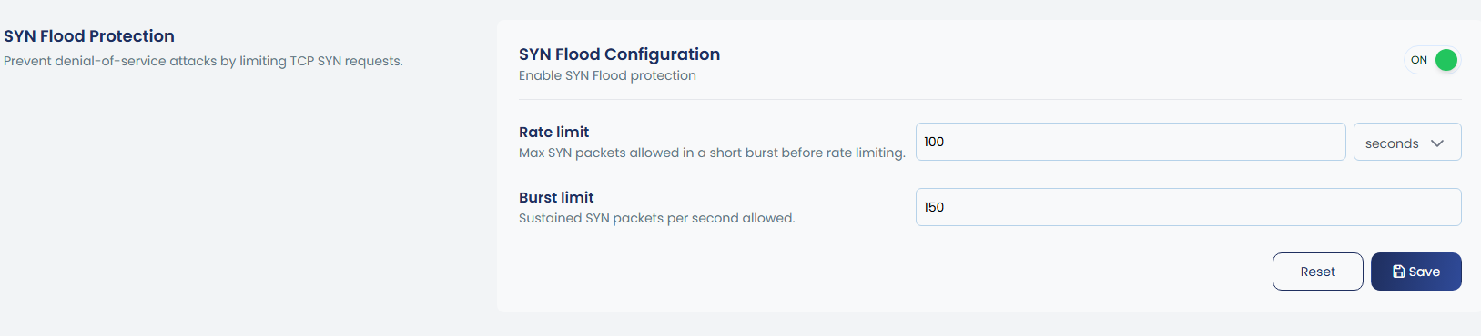 Enable SYN Flood Protection configures the firewall to defend against TCP SYN packet DoS attempts. It is important to set the rate carefully to minimize false positives, otherwise visitors may experience connection issues. You can monitor for blocked attempts in /var/log/messages