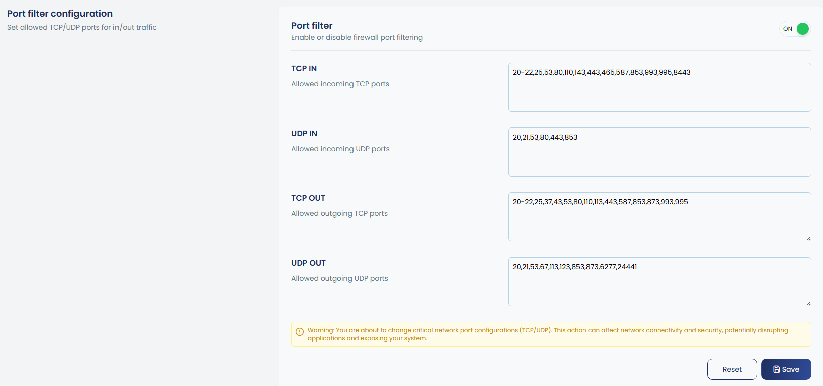 Port Filtering allows you to control inbound and outbound traffic by defining which TCP and UDP ports are permitted. When enabled, all ports are blocked by default except those explicitly allowed. You can manage input and output ports separately for both TCP and UDP, with options to add, remove, or list the allowed ports. This ensures only required services are accessible while closing all unnecessary ports for better security.