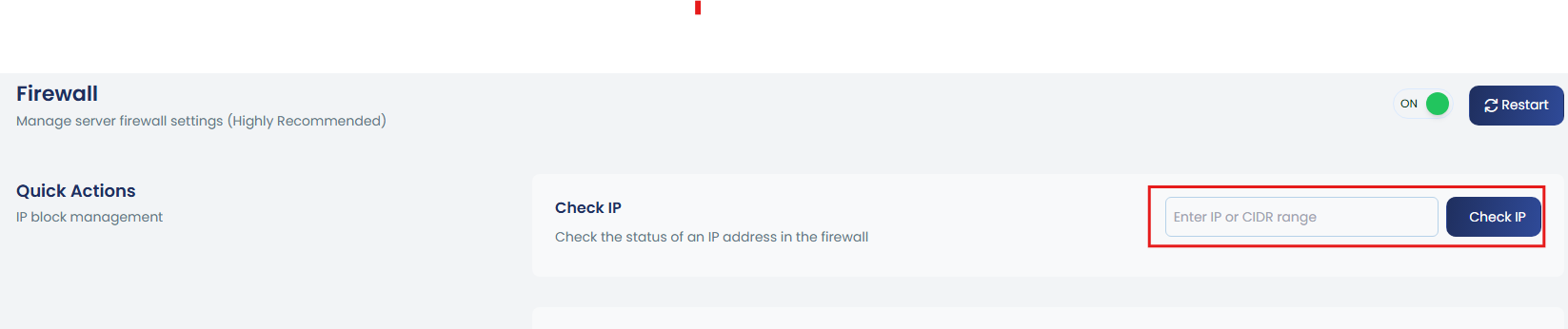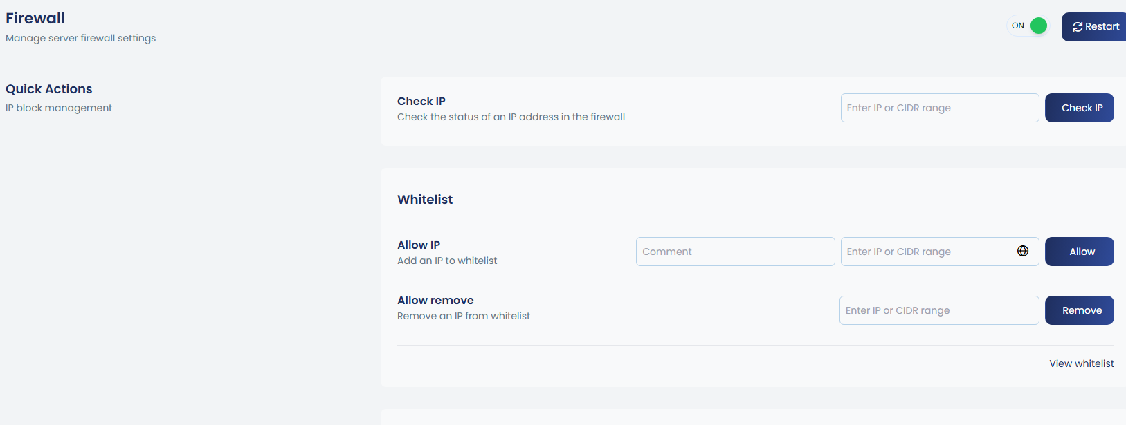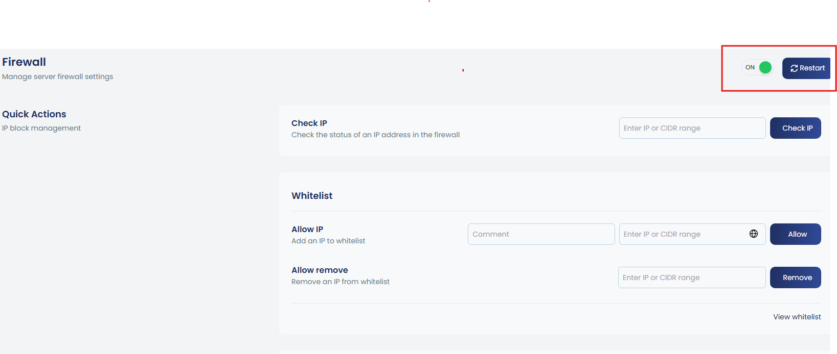 The firewall can be easily enabled or disabled using the toggle option, and restarts can also be initiated directly from the UI.