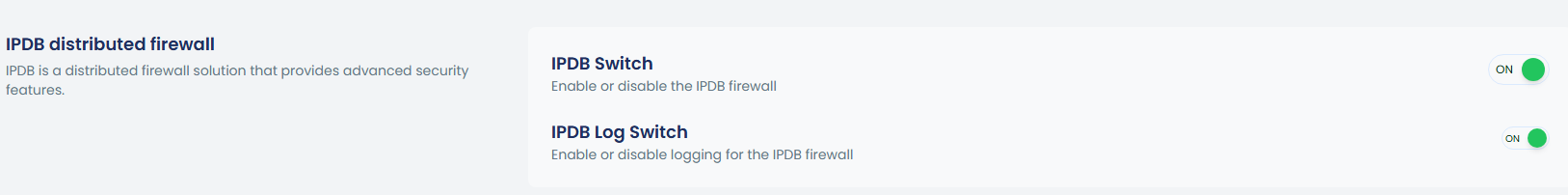The IPDB firewall can be managed from this section. You can turn it on or off using the toggle, and you can also enable or disable IPDB logging through the same toggle.