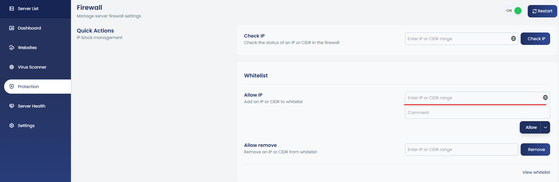 To whitelist an IP address from the App Portal, navigate to Server → Protection → Firewall → Whitelist. Enter the IP address in the provided input field, optionally add a comment as the reason, and then click Allow.