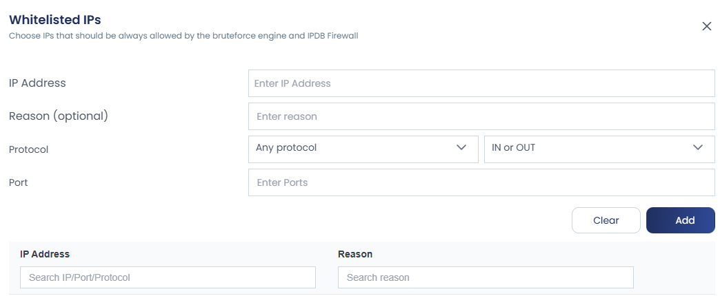 You can whitelist IPs for specific ports by optionally defining the protocol and direction. To do this, click on the ^ symbol next to Allow to expand the advanced options, then configure the required settings.
