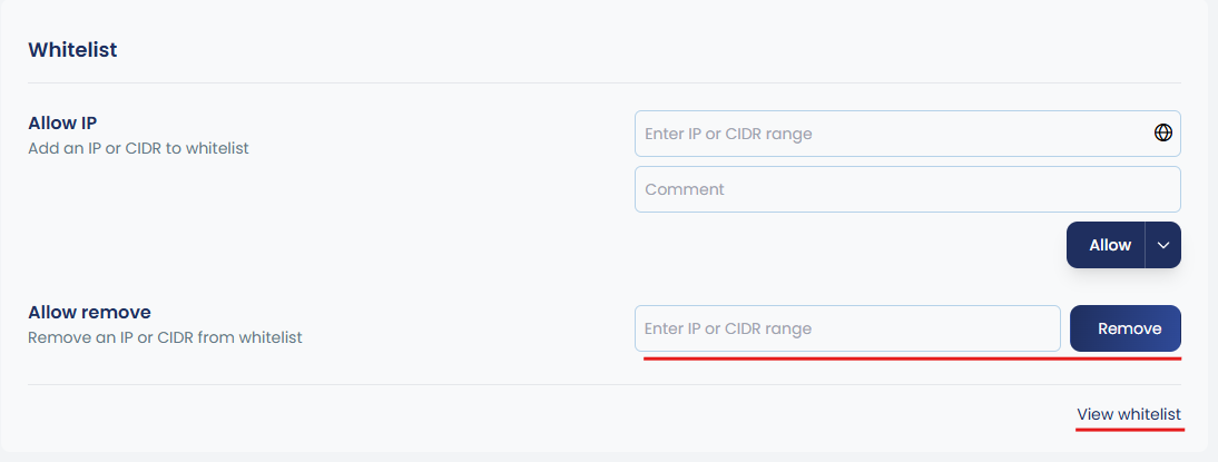 You can remove IPs from the whitelist by entering the IP address in the Allow  Remove input field and then clicking Remove. The CLI option also mentioned below.