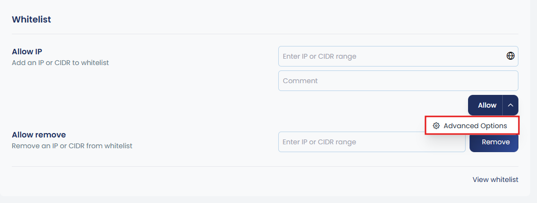 You can manage extended whitelists by importing IPs directly from files. This allows you to add, remove, or list multiple IP addresses in a centralized way, making it easier to maintain large or frequently updated whitelists. The available CLI options are: